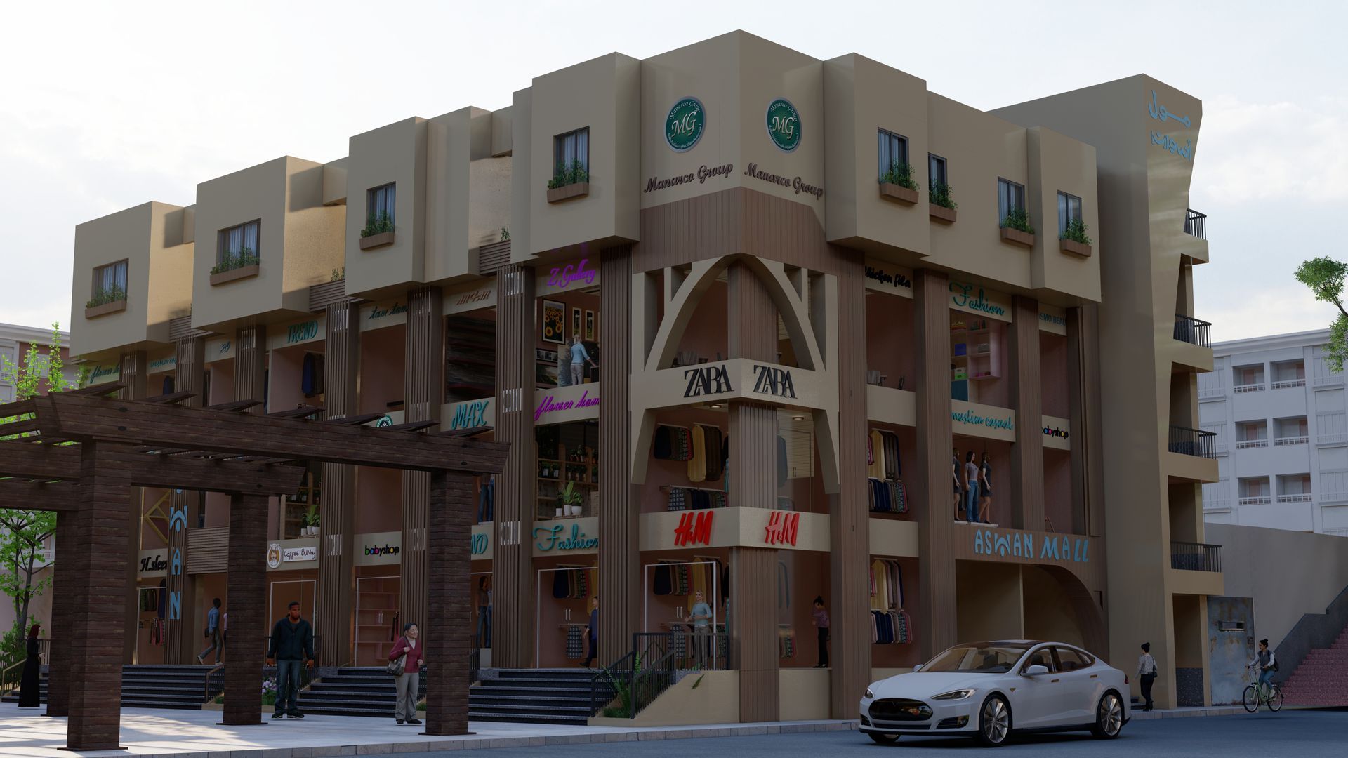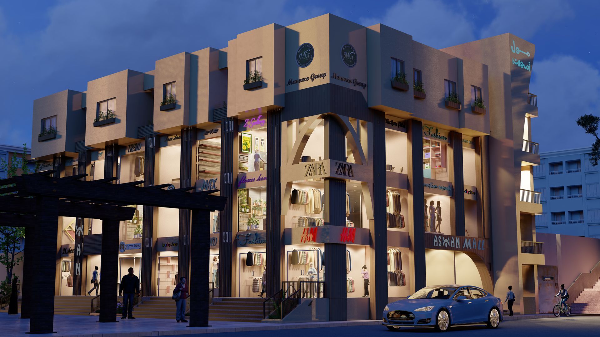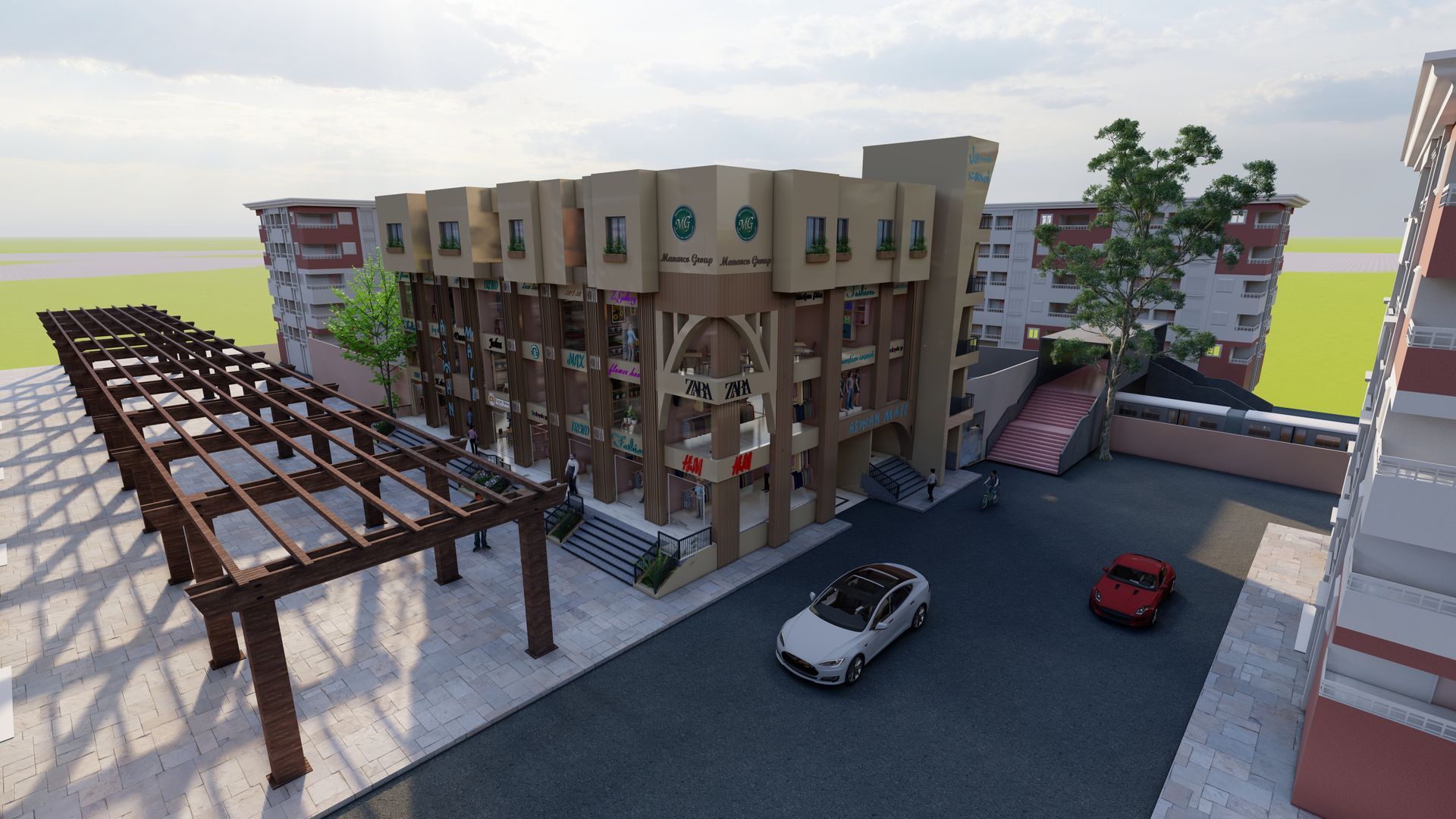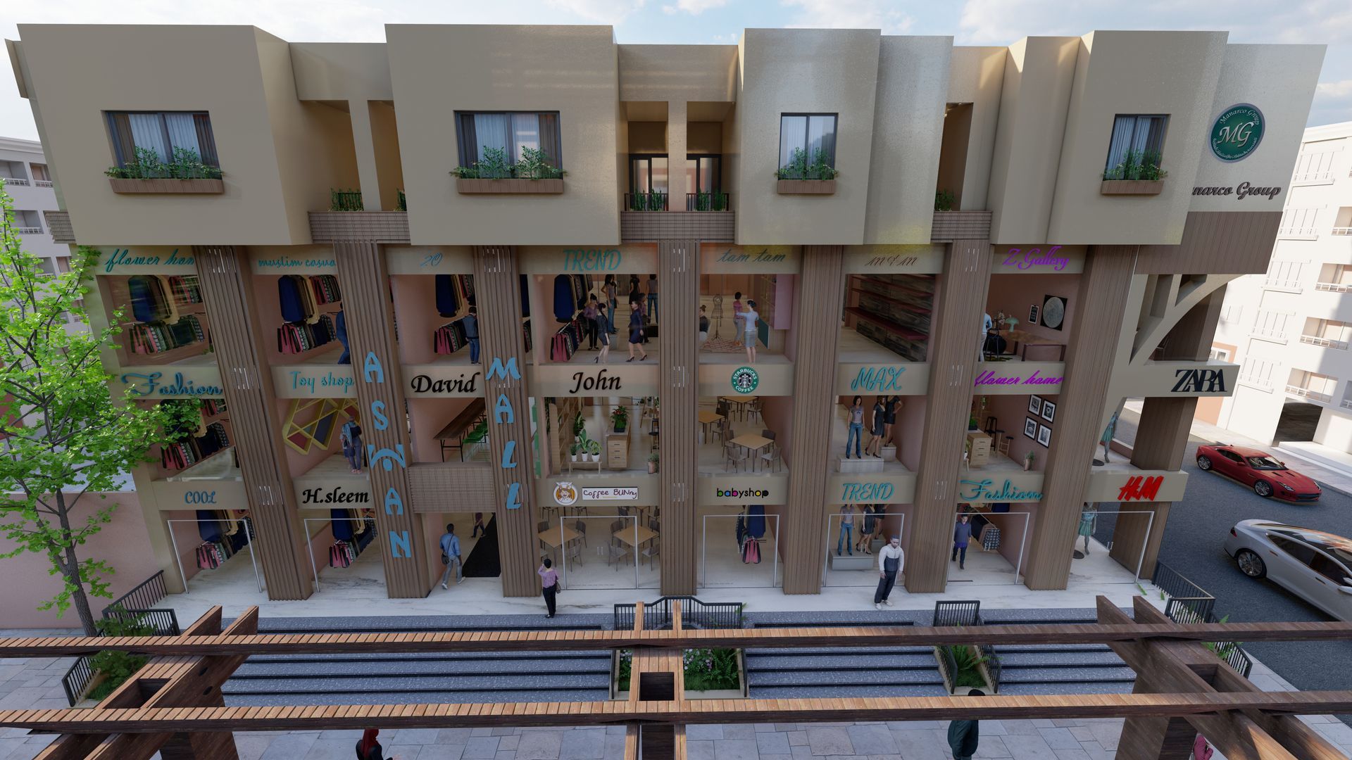 و دور ارضي و 3 ادوار علوية تضم270 محل تجاري مختلفة المساحات و التصميمات و مطاعم بالاضافة الى قاعات طعام و ملاهي للاطفال و سينما 4D وخدمات متكامله ترفيهيه.